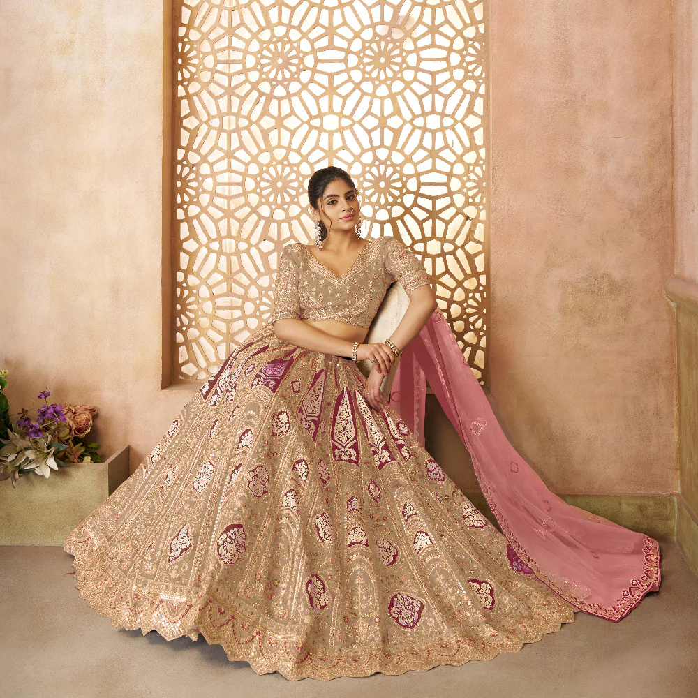 🌸 Champagne/Chiku Color Aari Embroidered Banarasi Lehenga for Brides