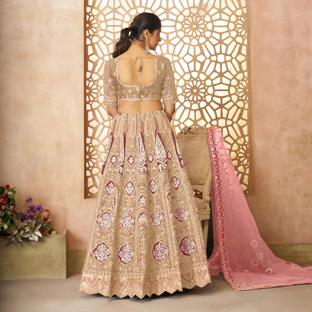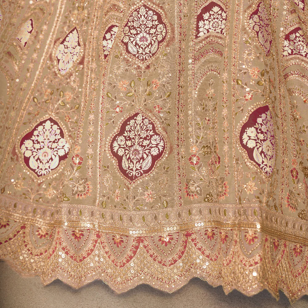 🌸 Champagne/Chiku Color Aari Embroidered Banarasi Lehenga for Brides