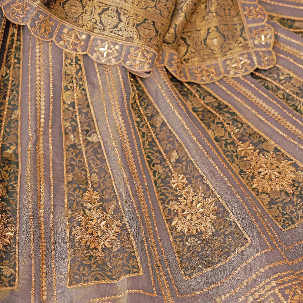 Onion Color Brocade Bridal Lehenga with Banarasi Patches and Zari Panel Work