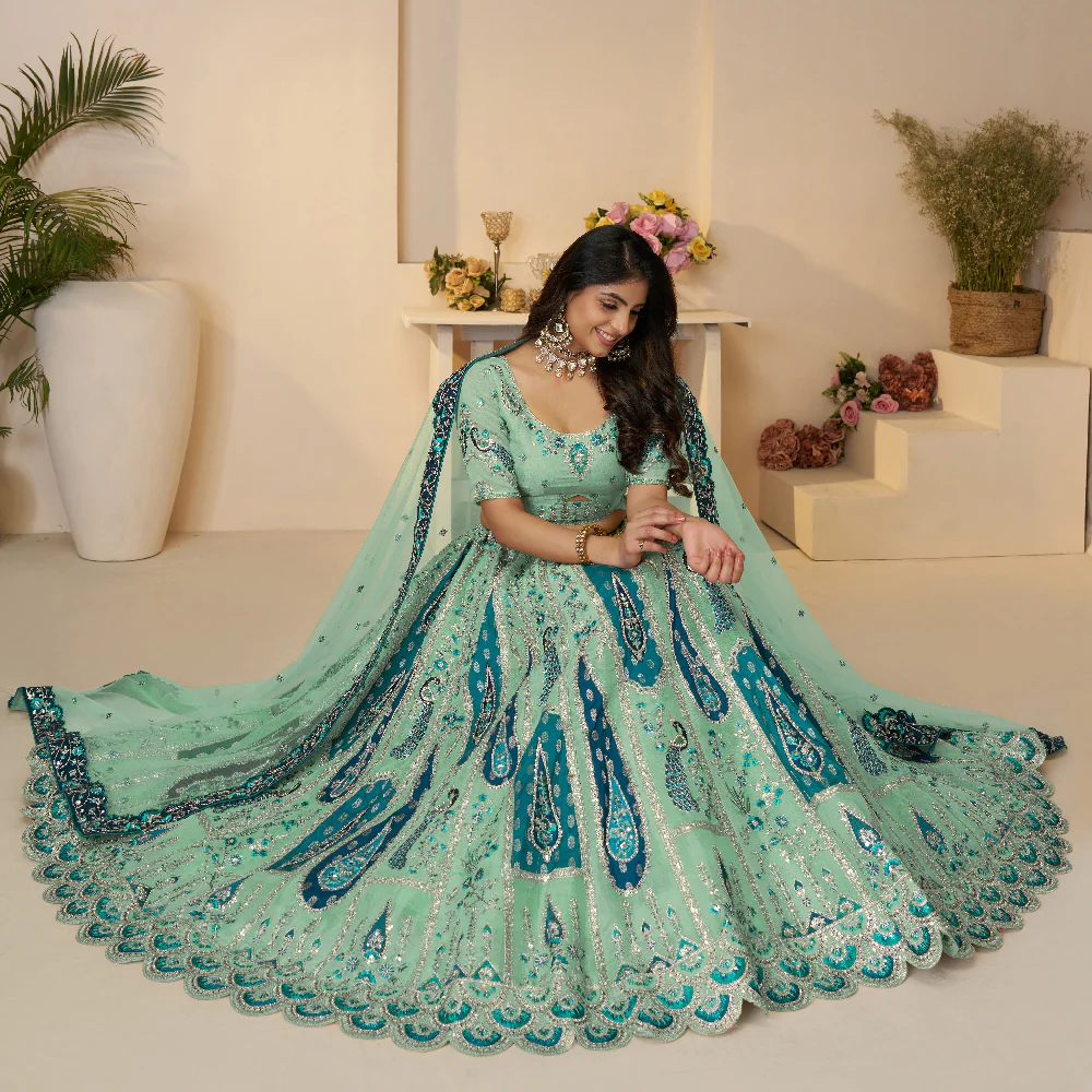✨ Paisley, peacock motifs, and heavy embroidery – Adds timeless grandeur