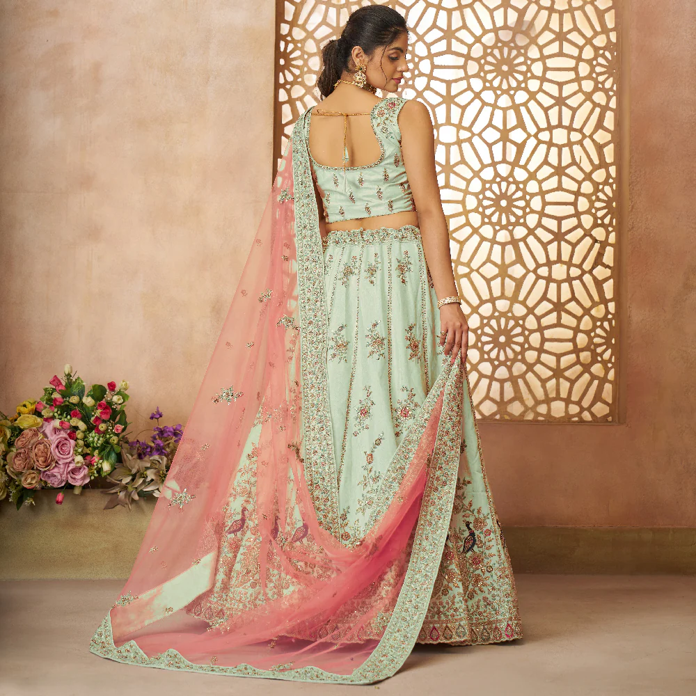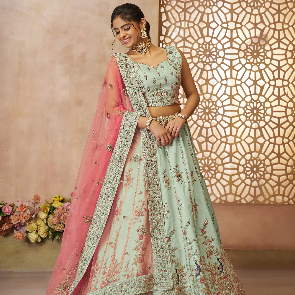 💚 Make a statement at any wedding celebration with this exquisite Banarasi silk lehenga choli. Designed to radiate grace & grandeur, it features intricate embroidery work ✍️ adding a touch of timeless charm. 🌸 Delicate floral motifs enhance its feminine appeal, while the rich Banarasi silk texture drapes beautifully — making it a perfect choice for weddings & festive occasions.