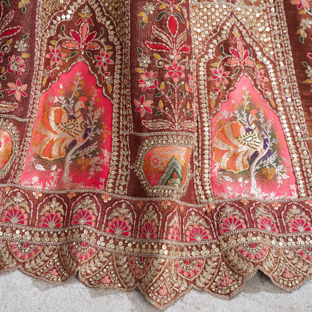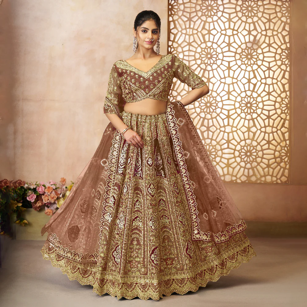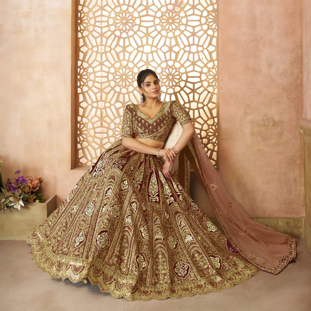 Make a bold statement at weddings with the Timeless Elegance Trending Lehenga Collection, an elegant Banarasi silk ensemble featuring patch work, Aari embroidery, and delicate motifs for a luxurious appeal. The rich Banarasi silk texture drapes beautifully, perfect for festive and wedding occasions. Includes semi-stitched lehengas, unstitched blouses, and dupattas for custom styling, available in Champagne/Chiku, Mocha, and Mocha/Coffee colors.
