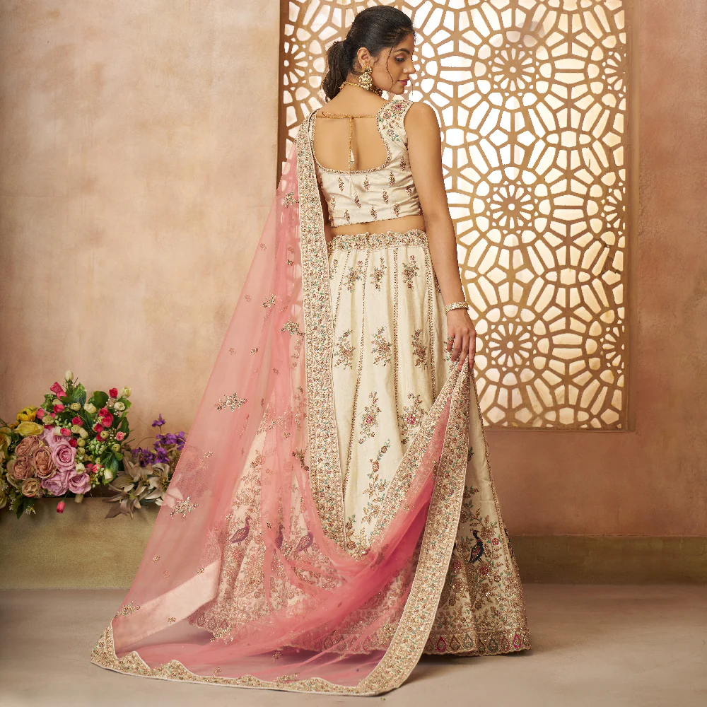 Make a striking statement at weddings with the White Modern Zari Silk Lehenga Set, an elegant ensemble featuring sequins and thread embroidery for a contemporary charm. The rich zari silk texture drapes beautifully, perfect for festive and wedding occasions. Includes a semi-stitched lehenga, unstitched blouse, and dupatta for custom styling.