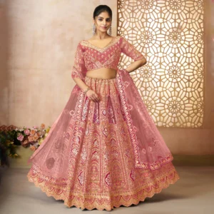 🌸 Pink Aari Embroidered Banarasi Lehenga for Weddings