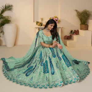 Make a regal statement at weddings with the Royal Grandeur Purple & Sky Blue Soft Net Lehenga Set, an elegant ensemble featuring paisley and peacock motifs with heavy embroidery for a luxurious appeal. The rich soft net texture drapes beautifully, perfect for festive and wedding occasions. Includes an unstitched blouse for custom styling.