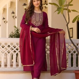 This stylish rayon kurta set offers a flowy silhouette, paired with a sleek pant and a lightweight chiffon dupatta. The breathable fabric and elegant design make it a go-to choice for everyday ethnic wear.